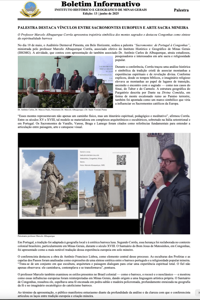 O Professor Marcelo Albuquerque Corrêa apresentou trajetória simbólica dos montes sagrados e destacou Congonhas como síntese da espiritualidade barroca No dia 10 de maio, o Auditório Dermeval Pimenta, em Belo Horizonte, sediou a palestra “Sacromontes: de Portugal à Congonhas”, ministrada pelo professor Marcelo Albuquerque Corrêa, associado efetivo do Instituto Histórico e Geográfico de Minas Gerais (IHGMG). A atividade, que contou com apresentação do também associado Dr. Antônio Carlos de Albuquerque, atraiu estudiosos, pesquisadores e interessados em arte sacra e religiosidade popular.