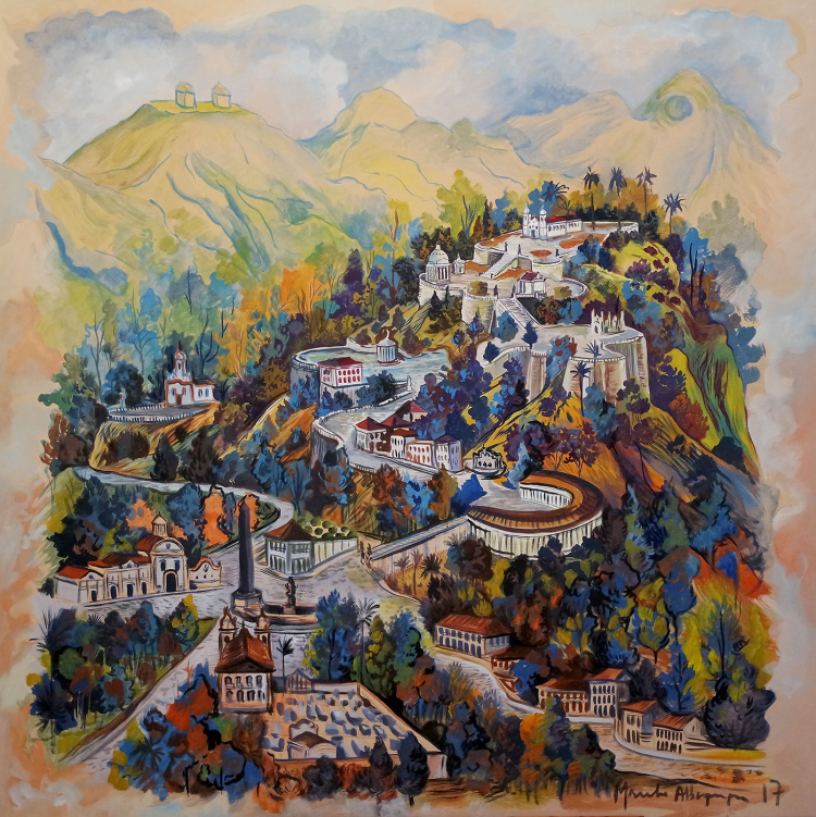 Em território brasileiro, especialmente em Minas Gerais, essa tradição não é apenas transposta, mas recriada com vigor e originalidade. O Santuário do Bom Jesus de Matosinhos, em Congonhas, edificado sob a inspiração direta dos modelos portugueses, especialmente do sacromonte de Braga, constitui um dos mais notáveis exemplos dessa geografia sagrada no Novo Mundo. Neste contexto, observa-se uma síntese singular entre a erudição teológica e simbólica europeia e a religiosidade popular do interior mineiro, manifestada nas romarias, no jubileu, na oralidade e na cultura visual vernacular. A paisagem mineira, com suas serras, igrejas e caminhos de fé, torna-se suporte da fé encarnada no território e na memória coletiva.