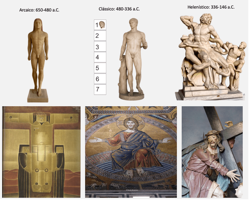 Figura 2: os períodos arcaico, clássico e helenístico e comparações com outros períodos artísticos. Acima: Arcaico: Kroisos Kouros. Mármore Parian. Encontrado em Anavyssos, Ática. C. 530 a.C. Museu Arqueológico de Atenas. Foto: Marcelo Albuquerque (2024). Clássico: Doríforo e suas proporções. Galeria Uffizi, Florença. Foto: Marcelo Albuquerque (2015). Helenístico: O Grupo Laocoonte, cópia romana segundo um original grego do séc. I a.C. (c. 50 a.C.). Mármore. Aguesandro, Polidoro e Atenodoro. Museus Vaticanos. Foto: Marcelo Albuquerque (2025). Adaptação: Marcelo Albuquerque (2025). . Abaixo: Vicente do Rego Monteiro (Crucificação). Fonte: https://virusdaarte.net/vicente-do-rego-monteiro-a-crucifixao/. Mosaicos do Batistério de Florença. Antônio Francisco Lisboa: Cruz às Costas. Congonhas, Minas Gerais. Fotos: Marcelo Albuquerque, (2015; 2016). Adaptação do autor.