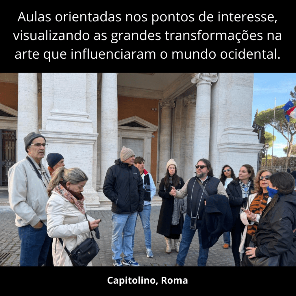 Ao longo da viagem, abordamos acervos e referências que abrangem Mesopotâmia, Egito, Grécia, Roma Antiga, Idade Média, Renascimento, Barroco, Rococó, Neoclassicismo e outros movimentos determinantes para a formação da cultura visual europeia. As aulas são orientadas nos próprios pontos de interesse, com análise das grandes transformações que influenciaram o mundo ocidental.